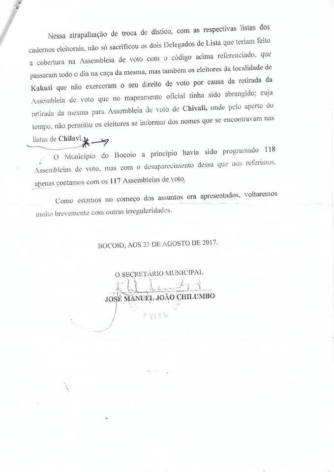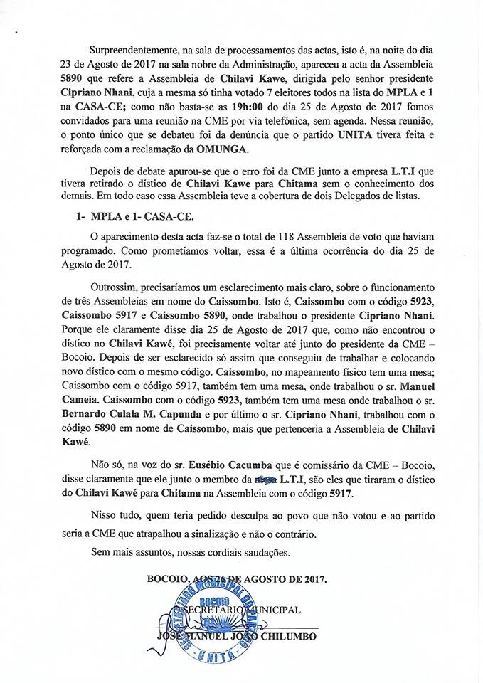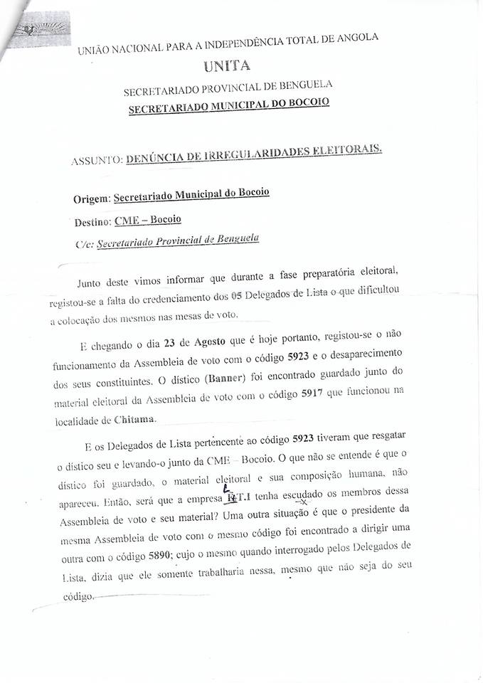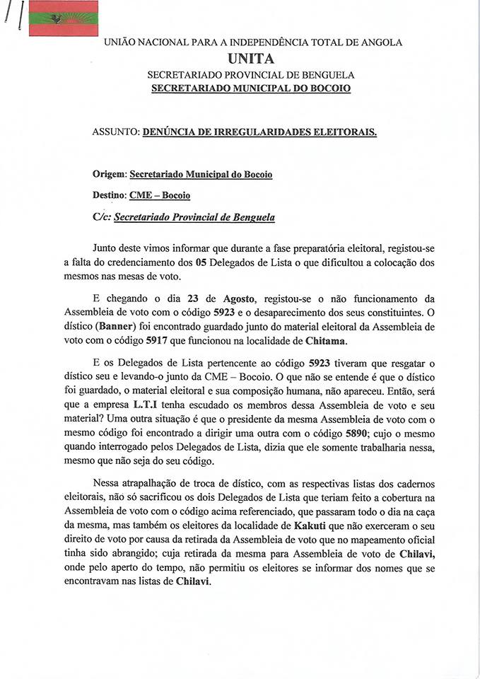 O município do Bocoio, em Benguela, está com 1.039 cidadãos que não puderam votar porque seus nomes foram transferidos a distâncias de mais de 15 km, porque houve Assembleias que não funcionaram. A Comissão Provincial Eleitoral (CPE) de Benguela está a impor um resultado que não corresponde com as actas reais que a UNITA e outros partidos de oposição obtiveram a partir das actas que seus delegados de listas trouxeram a partir das mesas de votos onde trabalharam.