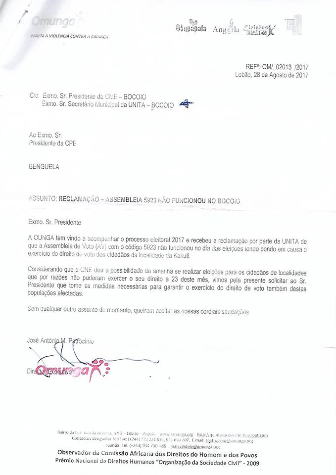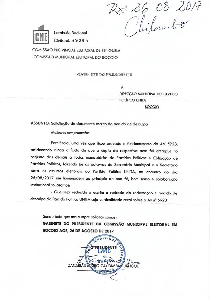 O presidente desta mesa foi o cidadão Bernardo Kulala M. Kapundo. Abaixo publicamos as reclamações da UNITA e da ONG OMUNGA que trabalhou na observação do pleito, bem como a resposta da CPE.