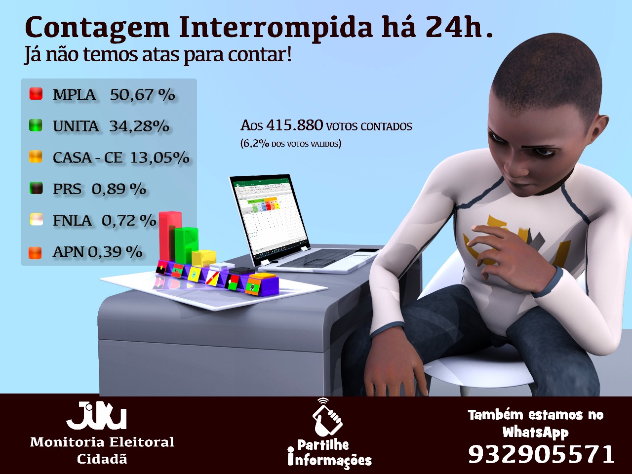 Temos neste momento 415.880 votos válidos contabilizados em 15 províncias (nenhuma acta de Malanje, Lunda-Sul e Moxico recebidas até hoje, 7 dias depois das eleições). O nosso objetivo era atingir os 670 mil para termos uns redondos 10% do total. Infelizmente há mais de 24 horas que deixámos de receber actas e ponderamos por esse facto ficar-nos por aqui, aguardando como todos os restantes, os resultados de quem tem acesso à totalidade desse documento imperativo para se poder avançar: A CNE (oficiais) e os partidos da oposição (paralelos).