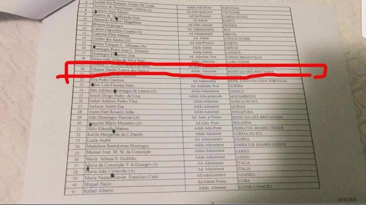 Uma lista com os nomes dos “funcionários com fim de comissão de serviços nas MD´s [missões diplomáticas]” elaborado pela direcção de recursos humanos do ministério das Relações Exteriores circula no Twitter, e nela consta o nome do “miúdo do relógio” que, segundo Gika Tetembwa, activista angolano residente na Inglaterra, “nunca lhe vimos na embaixada”.