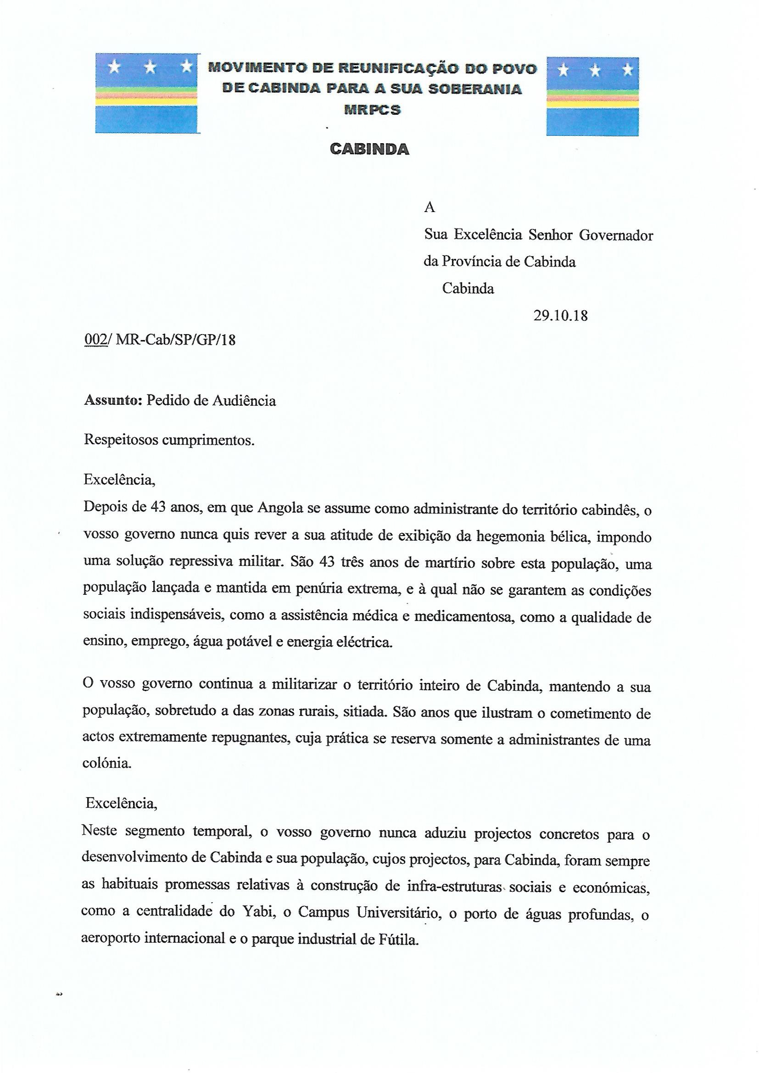 Segundo a organização, o documento foi remetido à secretaria do governo provincial mas esta recusou assinar o protocolo de recepção alegando que os documentos contrariam a Constituição da República de Angola. Para além da carta a solicitar uma audiência, onde é feita uma exposição dos principais problemas que enfrenta a província mais ao norte de Angola, o MRPCS remeteu outra “declaração pública” onde deixa claro que pretende contribuir para “uma solução definitiva ao problema”.
