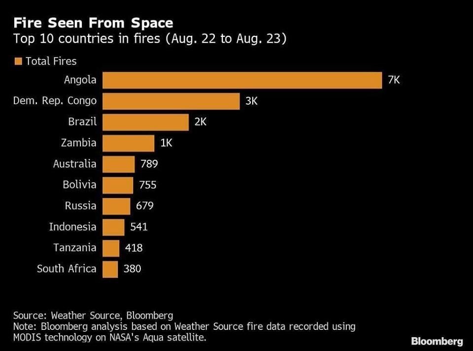 De acordo com a agência de notícias Bloomberg, que cita dados do satélite MODIS (Moderate Resolution Imaging Spectroradiometer) lançado pela NASA – agência espacial norte-americana – em 1999, Angola registou 6.902 fogos nas últimas 48 horas, mais do dobro dos 3.395 na República Democrática do Congo e mais do triplo dos 2.127 fogos registados no Brasil.