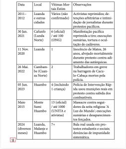 O relatório sustenta que os acontecimentos de Julho de 2025 não são isolados. Eles inserem-se num padrão documentado desde 2011, com episódios como Monte Sumi (2015), Cafunfo (2021), Cambambe (2022) e Huambo (2023):