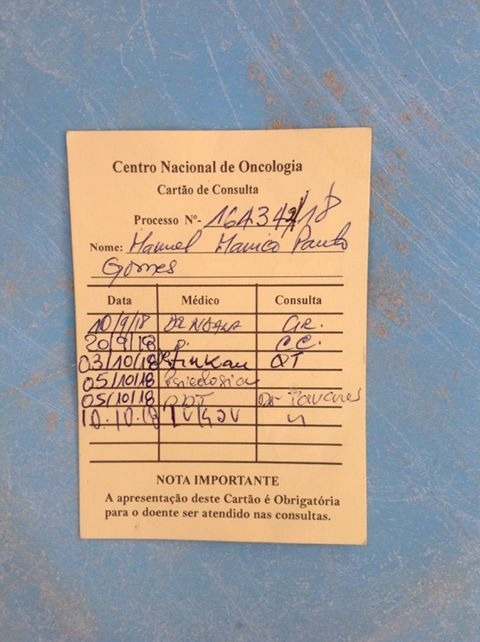 Quando liguei para a mãe a meados de Outubro e ela me informou que o Manico tinha sido devolvido para Benguela, ainda pensei que já tinha ido com todo o tratamento feito. Não era o caso. O boletim de consultas mostra que ele teve 6 consultas cujos códigos tenho estado a identificar com amigos médicos, mesmo não sendo eles da área de oncologia e não parecem casar com o anunciado:
