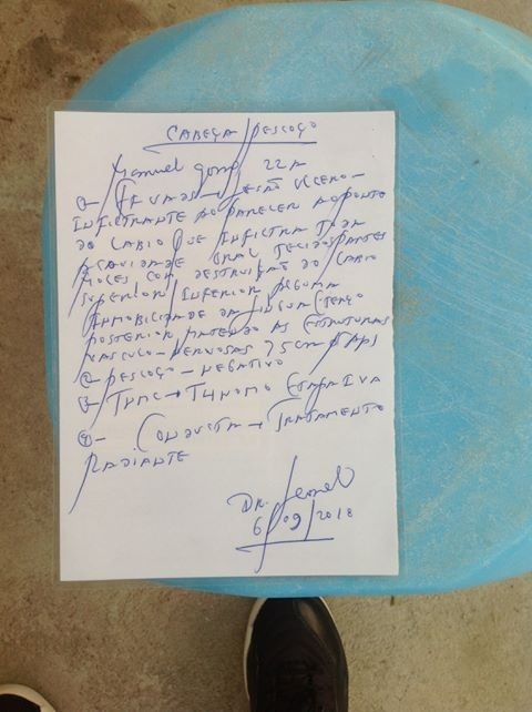 Finalmente, uma requisição de raio-x por preencher, um papel manuscrito pelo Dr. Leonel com um pré-diagnóstico indicando que o tratamento devia ser feito com recurso a radioterapia e, após um mês e meio internado e sendo visto apenas por 6 vezes, uma guia de transferência para o Hospital Geral de Benguela, com a indicação de tratamento meramente paliativo, já não radiante. É tudo o que consta no processo clínico que lhe foi entregue ao sair de Luanda.
