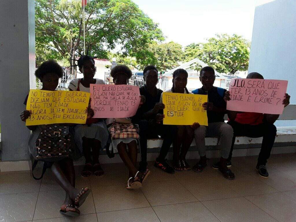 Conforme nos mostram as imagens abaixo, adolescentes fizeram uma manifestação na escola Comandante Zorró, onde exibiram panfletos em que se lê frases como “JLO, será que ter 13 anos de idade é crime?”; “Tenho 13 anos de idade. O governo do Moxico não quer que eu estude”; “Eu quero estudar. O governo não quer me colocar na sala de aula porque tenho 13 anos de idade”; “No tempo de guerra diziam que estudar não tem idade, agora estudar já tem. Com 13 anos de idade fui excluído”.