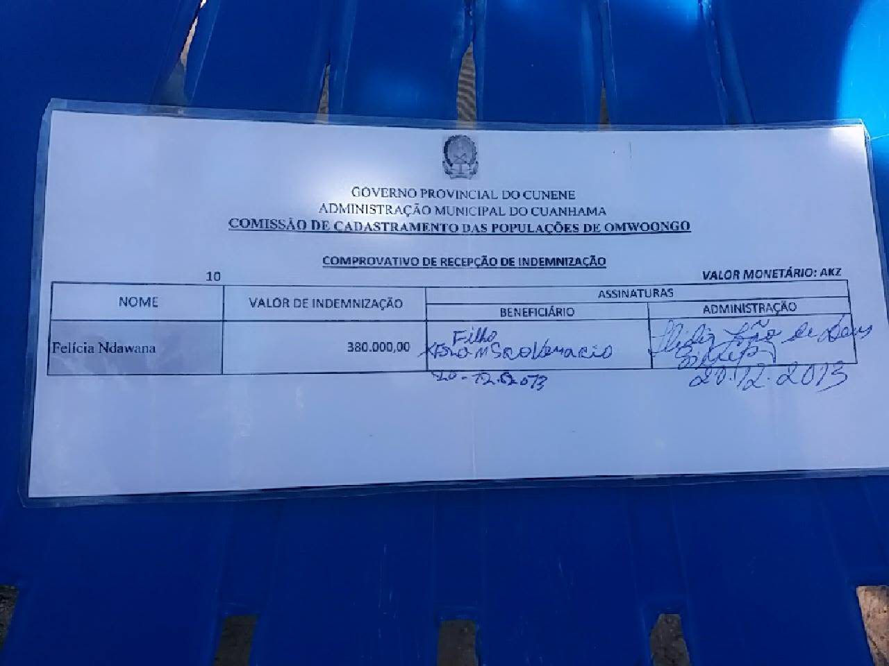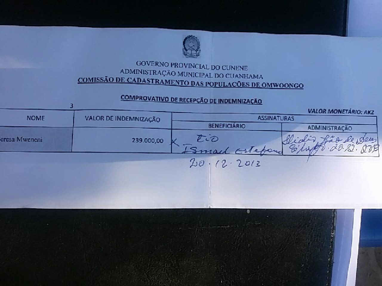 As expropriações começaram em 2013, e a administração pretende colocar a população na localidade de Oshimolo, e, em contrapartida, tem forçado os populares a receberem pequenas indeminizações em dinheiro (ver foto), mas a população diz que para onde estão a ser obrigados a irem não tem condições de realojamento”, pois pretendem colocá-los em tendas.