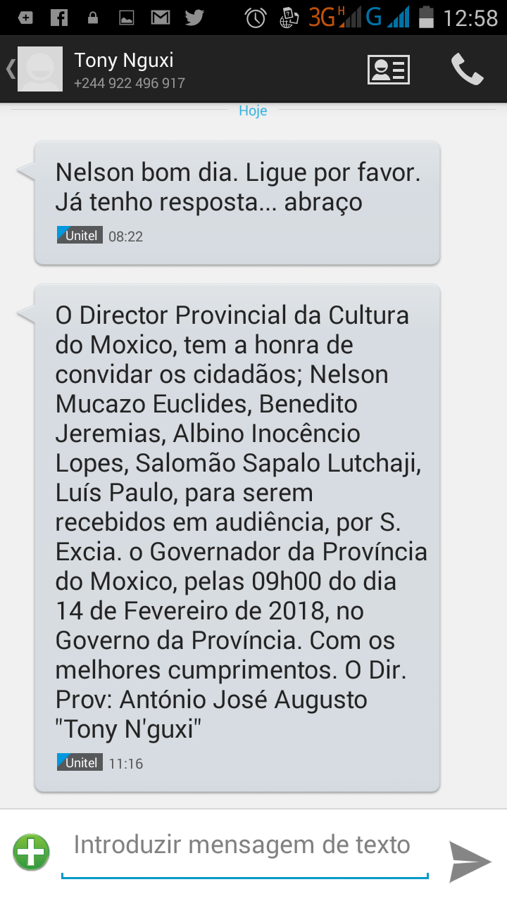 Vendo que os jovens ignoraram liminarmente esta carta, o Governo Provincial voltou a tentar convocá-los para um encontro, dessa vez já com “S. Excia o Governador”. A solicitação foi, uma vez mais, feita por SMS e pelo… Director Provincial da Cultura, o ilustre Tony Nguxi (ver imagem). A isto, os jovens responderam com uma carta, na qual afirmam total disponibilidade para se encontrarem com o Governador, mas apenas DEPOIS da manifestação.