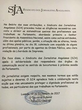 O Sindicato dos Jornalistas Angolanos (SJA), na voz do seu secretário-geral Teixeira Cândido, apelou ao boicote da imprensa angolana às sessões da Assembleia Nacional devido aos maus tratos a que os profissionais têm sido vítimas. A medida consta dum documento enviado aos órgãos de comunicação social no dia 19 do mês em curso.