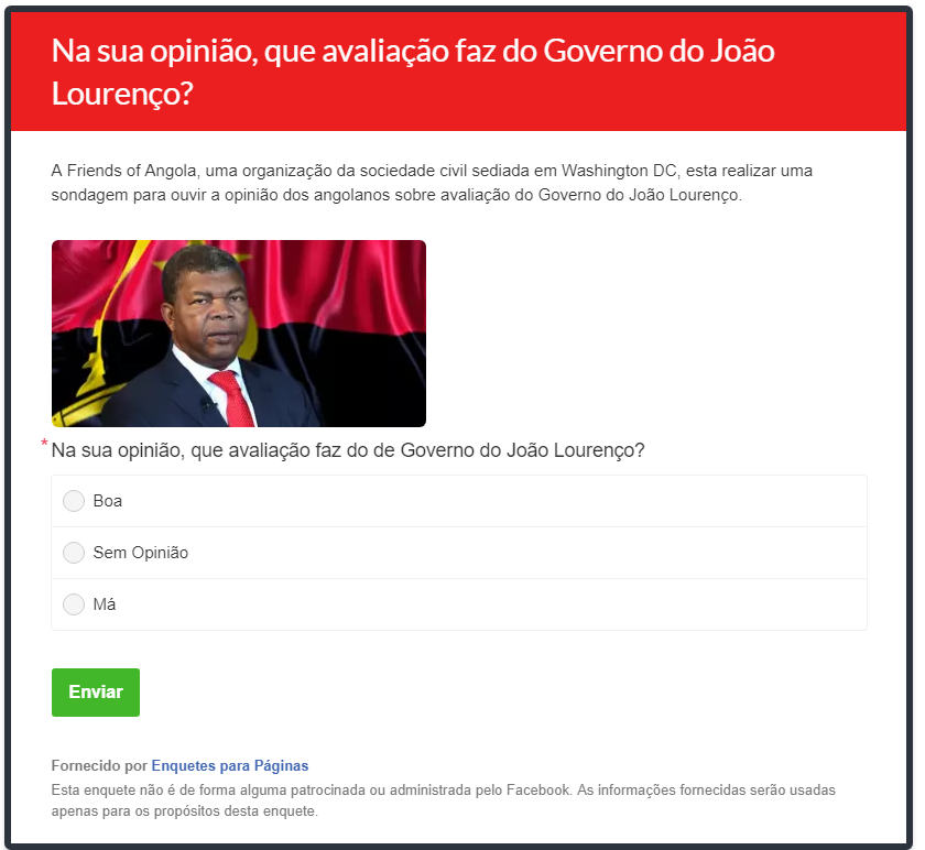 A Friends of Angola, uma organização da sociedade civil sediada em Washington DC, realizo uma sondagem para ouvir a opinião dos angolanos sobre avaliação do Governo do João Lourenço.