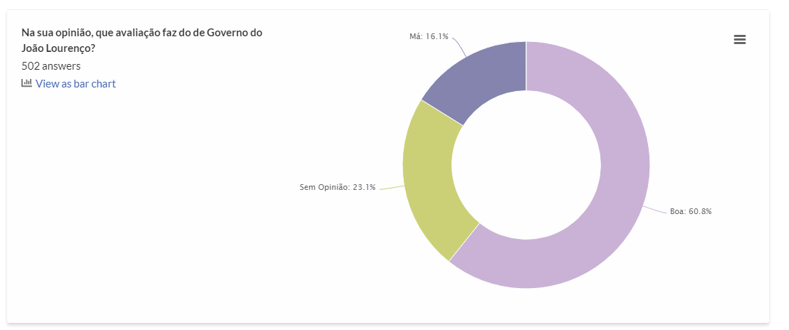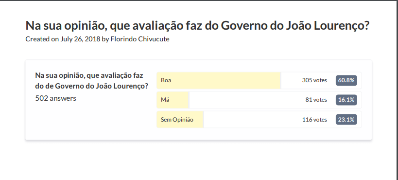 Segundo a sandagem feita pela Friends of Angola, 60.8% da população acredita que João Lourenço esta a fazer um bom trabalho. 16.1% acredita que o Presidente de Angola nao esta a fazer um bom trabalho e 23.1% diz que nao tem opinião sobre o desempenho do Governo de João Lourenço.